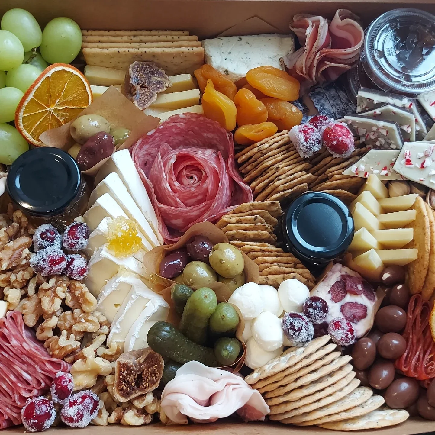 Includes a variety of meats, cheeses and crackers (at least 3 kinds), 1.5 oz jar of jam, 1.5 oz jar of honey with dipper, 2 oz of chutney, 4 oz of marmalade, as well as a diverse assortment of additional items such as dried fruit, nuts, seeds, olives, cornichons, fresh fruit and sweet treats!