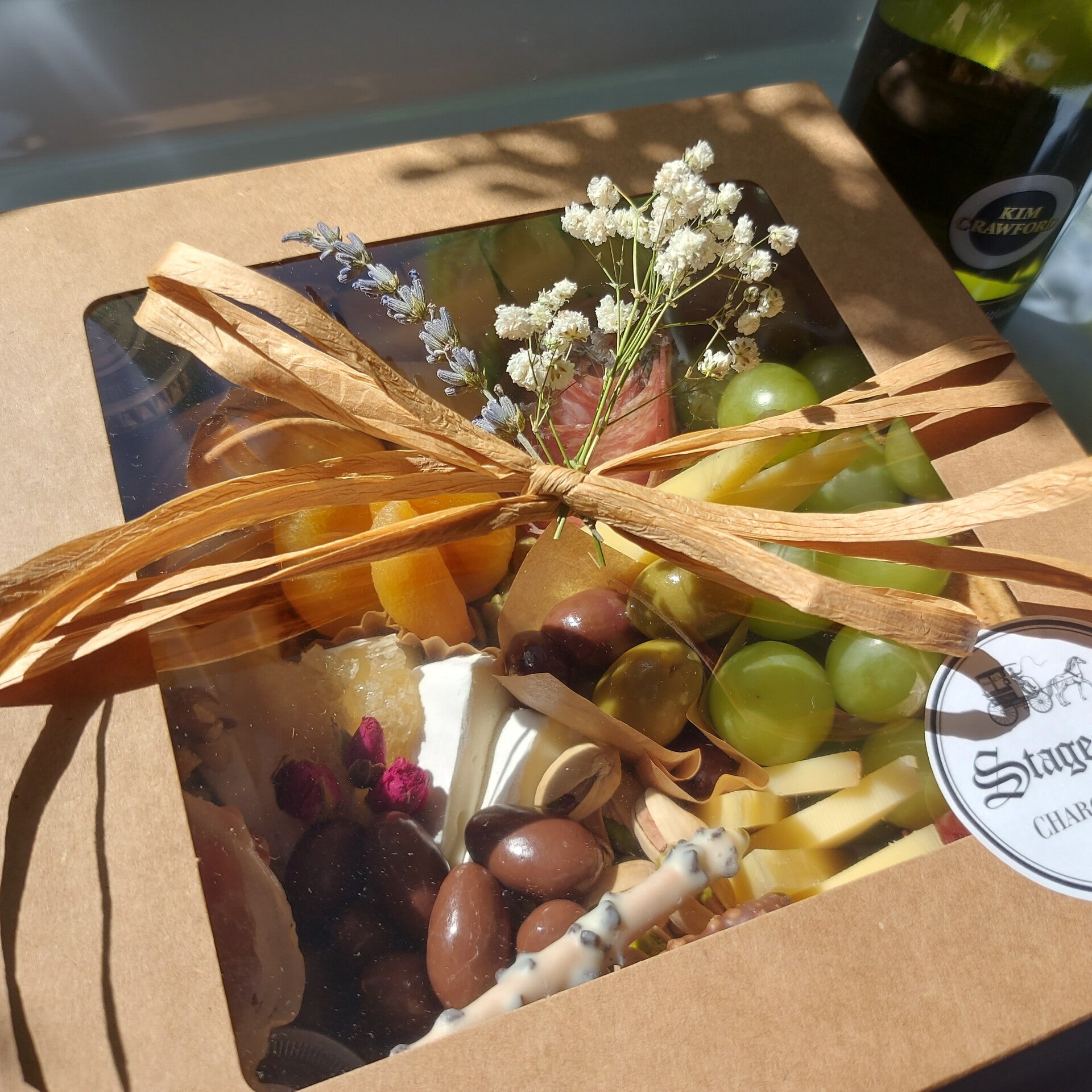 Includes a variety of meats, cheeses and crackers, 2 oz of honey, 2 oz of marmalade, 1 oz of jam, as well as a diverse assortment of additional items such as dried fruit, nuts, seeds, olives, fresh fruit and sweet treats!
